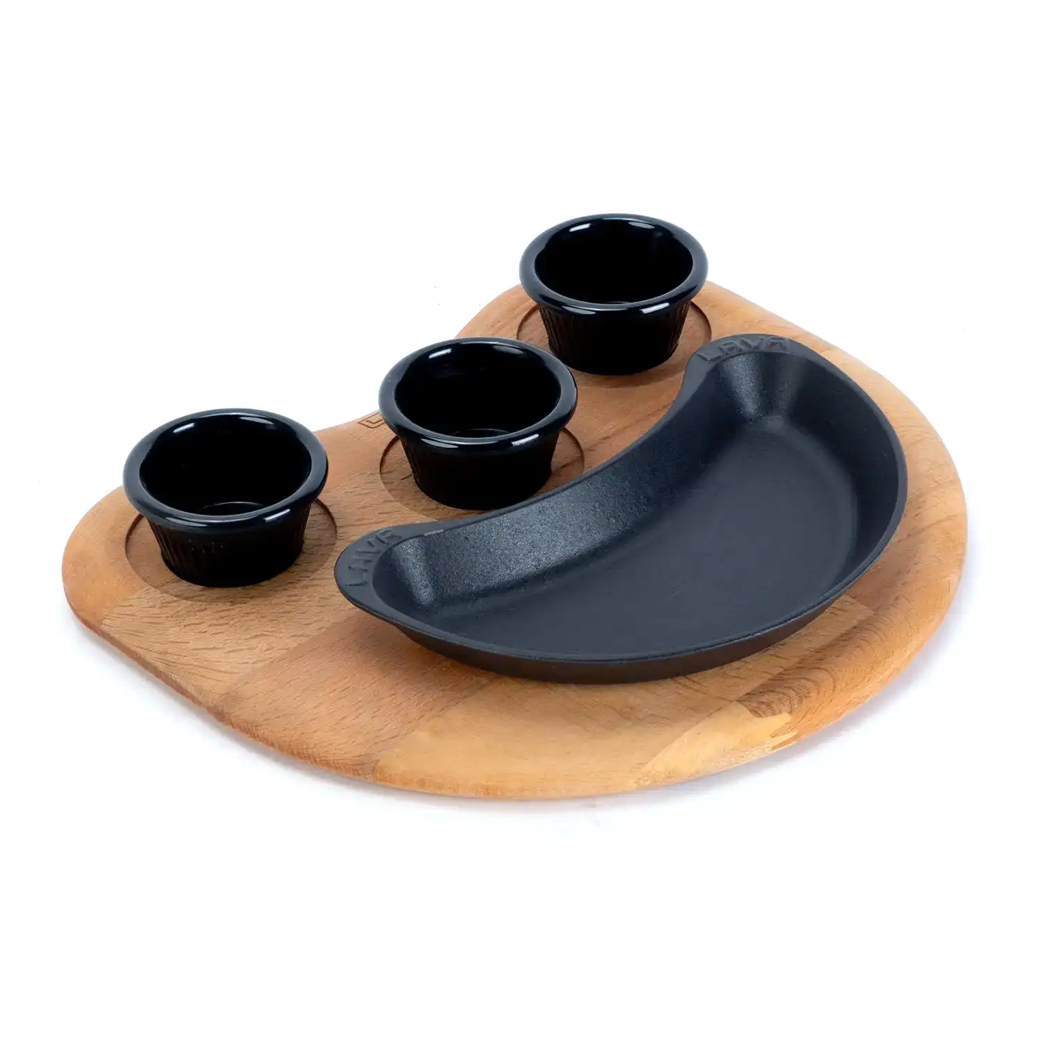 Lava Döküm Böbrek Formlu Fajita Tabağı Kayın Servis Ahşabı Ölçü 10x20cm. (Sos Kapları Dahil Değildir.)