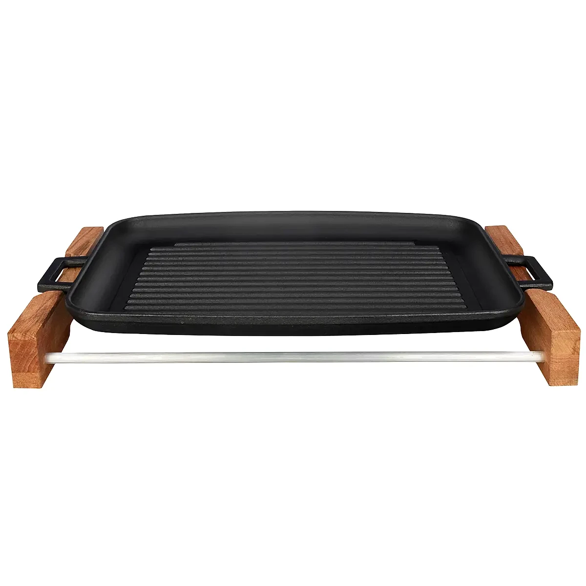 Lava Döküm Dikdörtgen Izgara Tepsi Kayın Servis Ahşabı Döküm Demir Yekpare Çift Kulplu Ölçü 31x42cm.