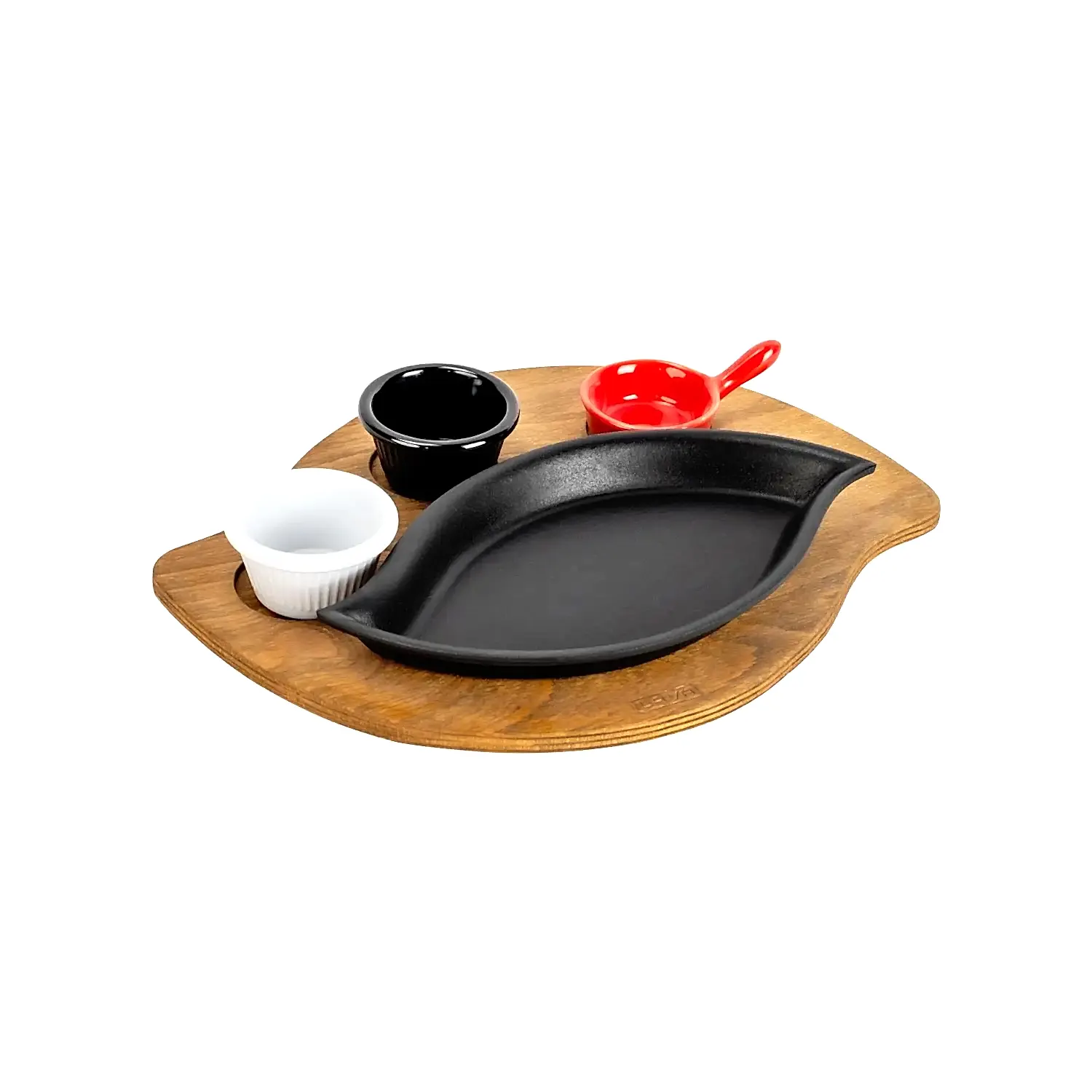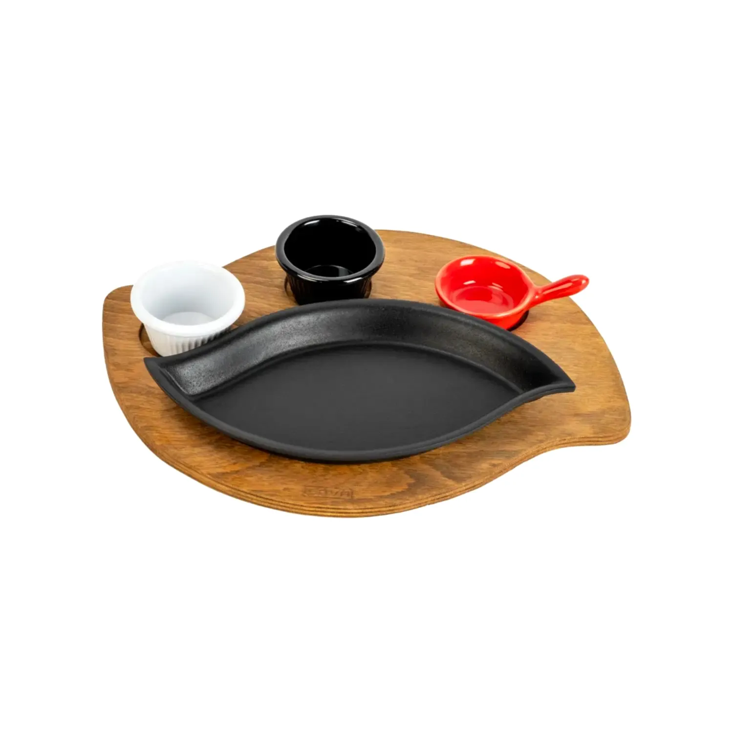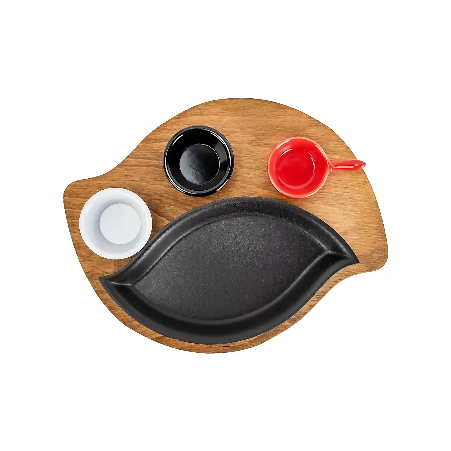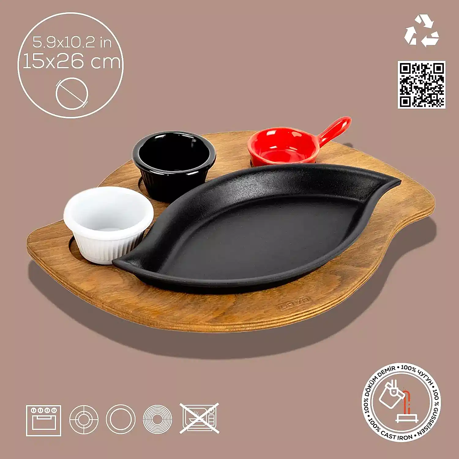 Lava Döküm Dikdörtgen Servis Tabağı ve Ahşap altlığı. Ölçü 15x26cm.