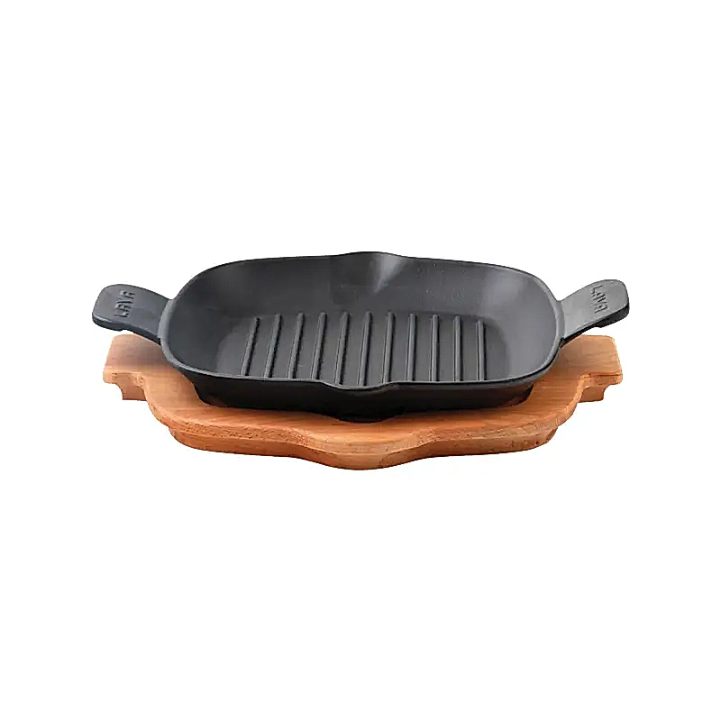 Lava Döküm Izgara Tavası Kayın Servis Ahşabı Döküm Demir Yekpare Çift Kulplu Ölçü 26x26cm.