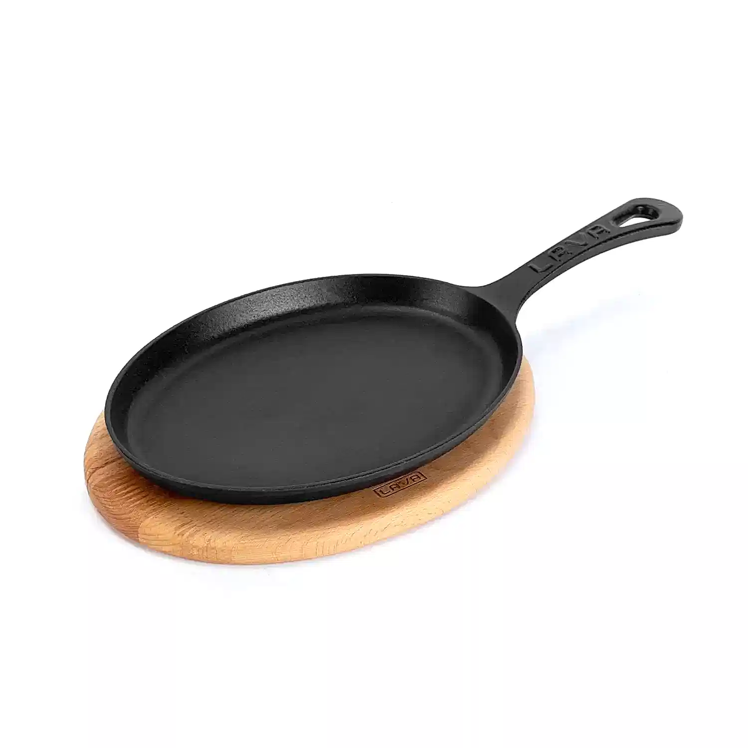 EtiketlerLava Döküm Oval Fajita Tabağı Döküm Demir Yekpare Saplı Kayın Servis Ahşabı Ölçü 17x23cm.