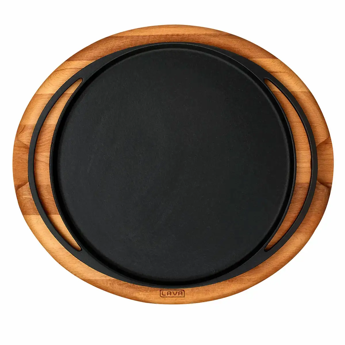 Lava Döküm Yuvarlak Pizza Krep Pankek Tavası Döküm Demir Yekpare Çift Kulplu Kayın Servis Ahşabı Çap(Ø)28cm.