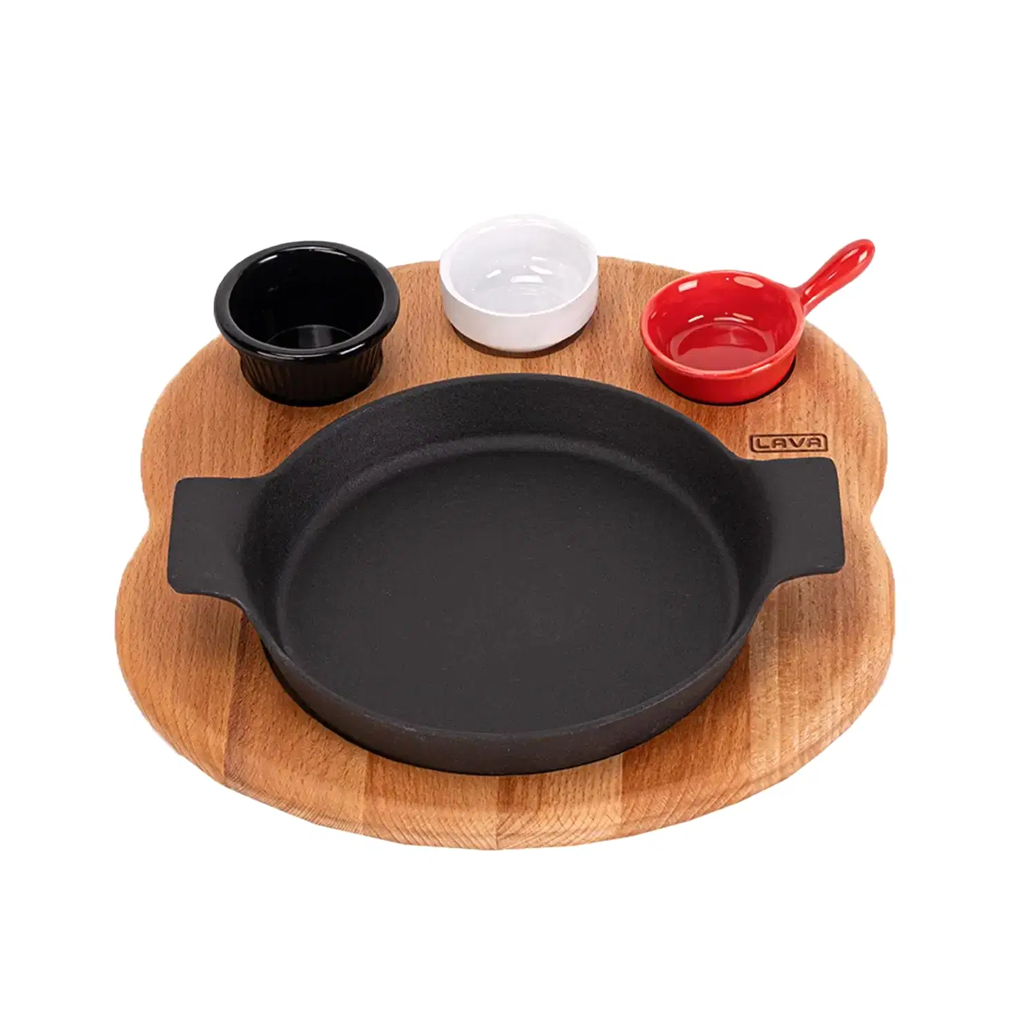 Lava Döküm Yuvarlak Sahan Döküm Demir Yekpare Çift Kulplu Kayın Servis Ahşabı. Çap(Ø)18cm. (Sos kapları dahil değildir.)