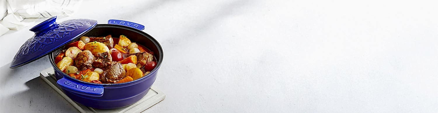 Sosu için tüm malzemeyi bir kâsede karıştırın. Lava Döküm Tencere’yi ocağın üzerine alın,  iyice ısınınca sıvı yağla birlikte kuzu etlerini tencereye alın. Kuzu etlerinin her tarafını kızartın. İrice kesilmiş patates ve havuçları, sarımsakları, arpacık soğanları ilave edin. Birkaç dakika daha kavurun. Sosunu dökün. Birkaç taşım kaynayınca ateşi iyice kısın, tencerenin kapağını kapatın. Kısık ateşte, 45 dakika pişirin. Çeri domatesleri ve bezelyeyi ilave edin, tencerenin kapağını kapatıp 15 dakika daha pişirin.